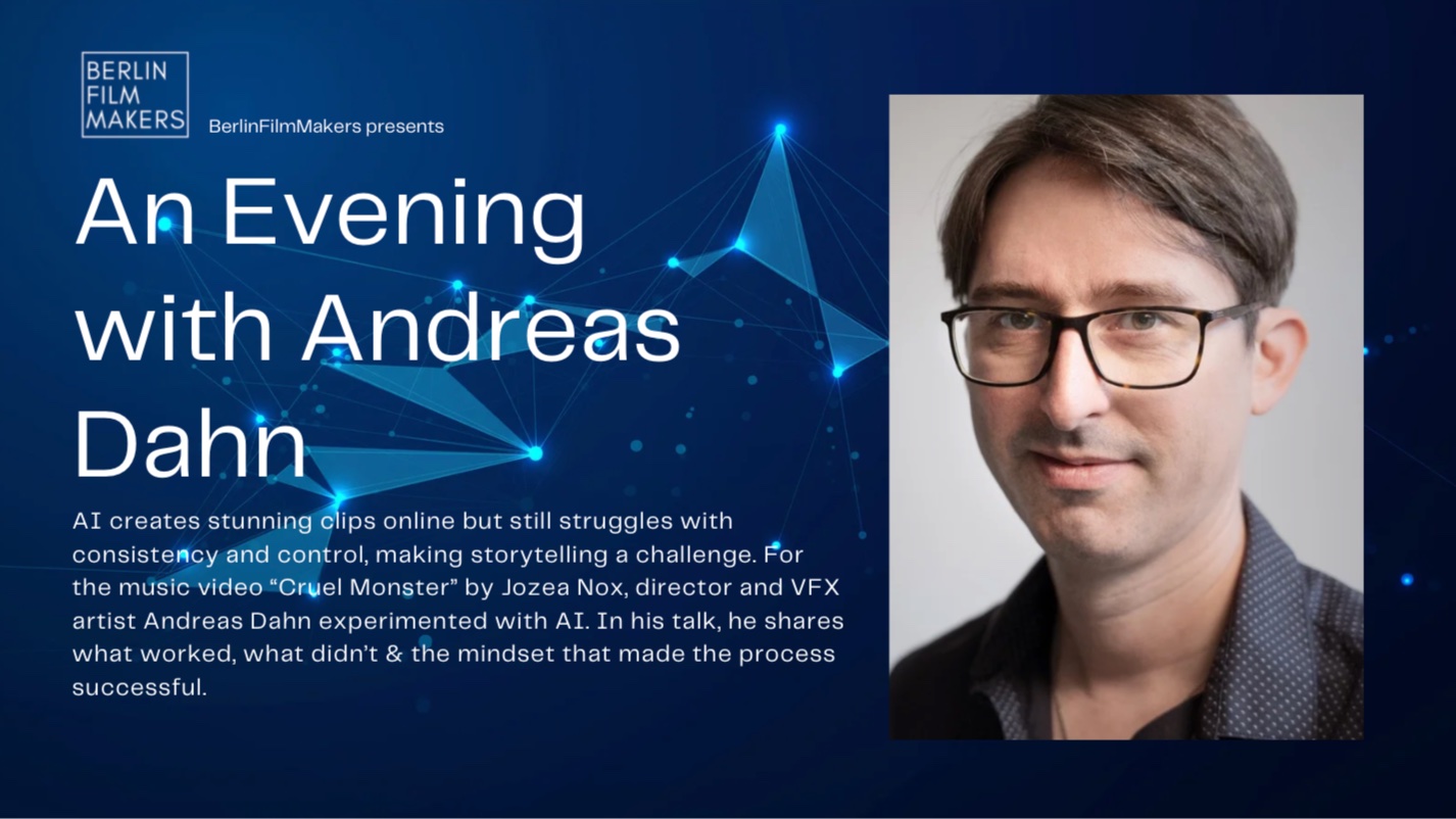 🎬 **Exploring AI in Filmmaking with Andreas Dahn** AI can create stunning visuals — but can it tell a story? In this session, **director and VFX artist Andreas Dahn** shares his experience using AI in the music video **“Cruel Monster”** by **Jozea Nox**. He’ll discuss **what worked, what didn’t, and the mindset** that helped him navigate the creative and technical challenges of integrating AI into a professional film workflow. Perfect for anyone interested in **AI, digital filmmaking, VFX, or storytelling.** Join us in our conversation with him to learn what worked, what failed and what mindset it takes to turn AI into a real Storytelling tool. 🗓️Event date: 11.11.25 📍Location: Cuvrystraße 4, 10997 Berlin 🕡Time: Doors open at 6:30pm - Free Admission