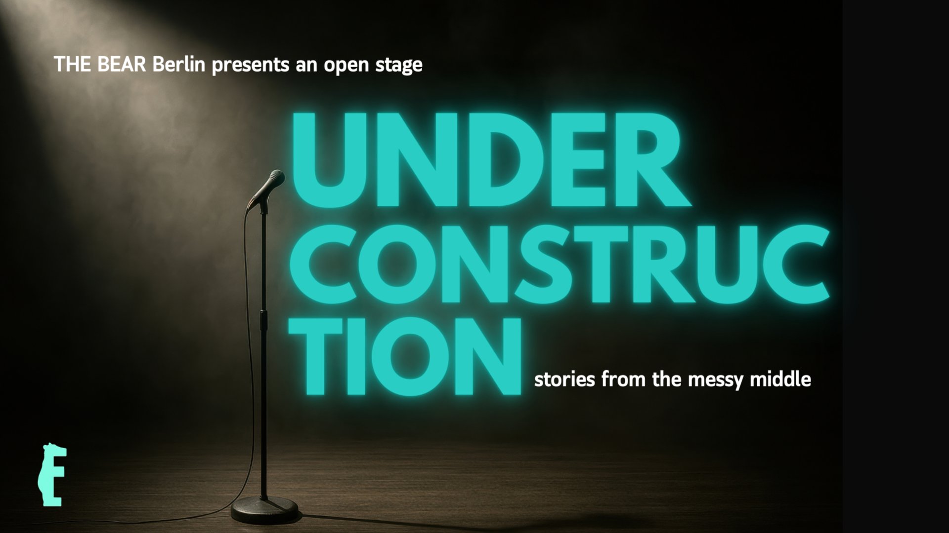 ## THE BEAR presents an open stage ## 🛠️ UNDER CONSTRUCTION **Stories from the messy middle** January is the season of the unfinished. At THE BEAR, we celebrate true, personal stories that live in the in-between... ... stories of repair, rebuilding, and reinvention. Stories held together with metaphorical duct tape. Stories that prove being unfinished might be exactly where the magic is. **If your story isn’t *done* yet, it belongs here.** 🎤 Open Stage · True personal stories (5 minutes) 🗓️ **Thursday, Jan 15, 2026 · 19:00** 📍 Theatre Pool, Berlin 🎟️ 15–20 € (pay what you can) Come as you are: unfinished, in progress, **under construction**. 🐻✨ 👉 **[Tickets:](https://www.eventbrite.com/e/the-bear-presents-under-construction-stories-from-the-messy-middle-tickets-1979312038589?aff=oddtdtcreator&_gl=1%2A1mvhyfo%2A_up%2AMQ..%2A_ga%2AMjA5Mjk0NzI0NS4xNzY3MTc4MjE0%2A_ga_TQVES5V6SH%2AczE3NjcxNzgyMTQkbzEkZzEkdDE3NjcxNzgyNDckajI3JGwwJGgw)**[ €15–20 (sliding scale donation)](https://www.eventbrite.com/e/the-bear-presents-under-construction-stories-from-the-messy-middle-tickets-1979312038589?aff=oddtdtcreator&_gl=1%2A1mvhyfo%2A_up%2AMQ..%2A_ga%2AMjA5Mjk0NzI0NS4xNzY3MTc4MjE0%2A_ga_TQVES5V6SH%2AczE3NjcxNzgyMTQkbzEkZzEkdDE3NjcxNzgyNDckajI3JGwwJGgw) ## **Our Mission** ## *THE BEAR* has grown into one of Berlin’s most beloved live storytelling events: a place where strangers become a community through the simple act of listening. Supported by: [THE BEAR e.V. ](https://deref-web.de/mail/client/3fe0d0dh9KM/dereferrer/?redirectUrl=https%3A%2F%2Fthebear-storytelling.us6.list-manage.com%2Ftrack%2Fclick%3Fu%3Db5d7f087b587f8f081c447437%26id%3Dfc0e2d8df3%26e%3D711d4db9af), [Moving-Speaker.com](https://www.moving-speaker.com/), [Female Speaking Berlin](https://www.femalespeakingberlin.com/), and [Experience Berlin Youtube Channel](https://www.youtube.com/@Berlin-Videos).