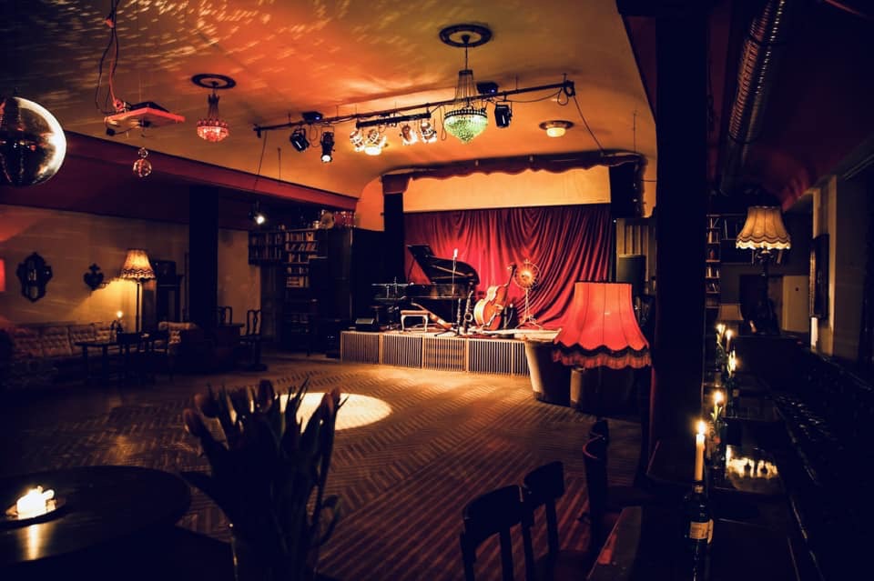 Cocktails & live music at a former movie theater lit by standard lamps & candles.