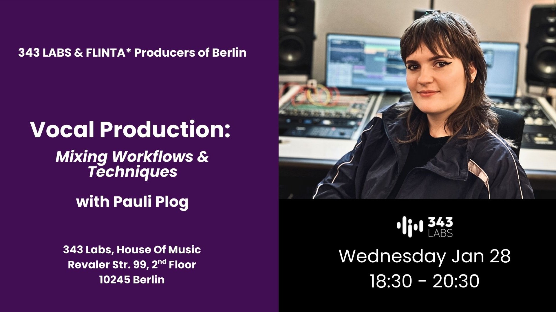 Learn about **vocal production** from a professional audio engineer and ask her all your questions! **This event is free and open to everyone!** RSVP on the [343 Labs Website](https://343labs.de/events/) to save your seat! Join us: **Wednesday, January 28** **18:30–20:30** **House of Music (343 Labs, 2nd floor)** **What to expect:** In this workshop, we’ll dive into a session and break down the vocal mixing process step by step, including workflows and techniques. We’ll briefly touch on vocal recording essentials and leave plenty of space for questions and open discussion.