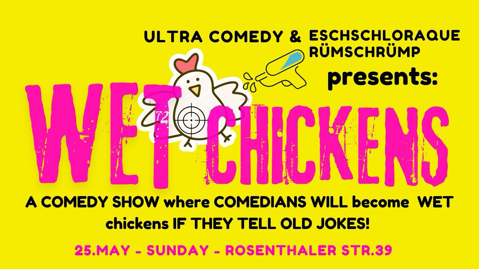 Welcome to Wet Chickens Comedy - The CREATIVE Open Mic that isn't like any other Open Mic! Comedians aren't allowed to use any old material - NEW JOKES ONLY! And in case they do old jokes. they will get wet, because the host will spray them with a toy water pistole!* *or with something else, but we will! When? Every Monday from 8PM Where? Agata Bar, Weichselstr. 55 in Berlin, Neukölln How much? Its FREE, just get you a reservation, because they might be SOLD OUT soon Doors: 19:30 Show: 20:00 *Reservations are only kept until 19:50, so please arrive before that for assured seating.