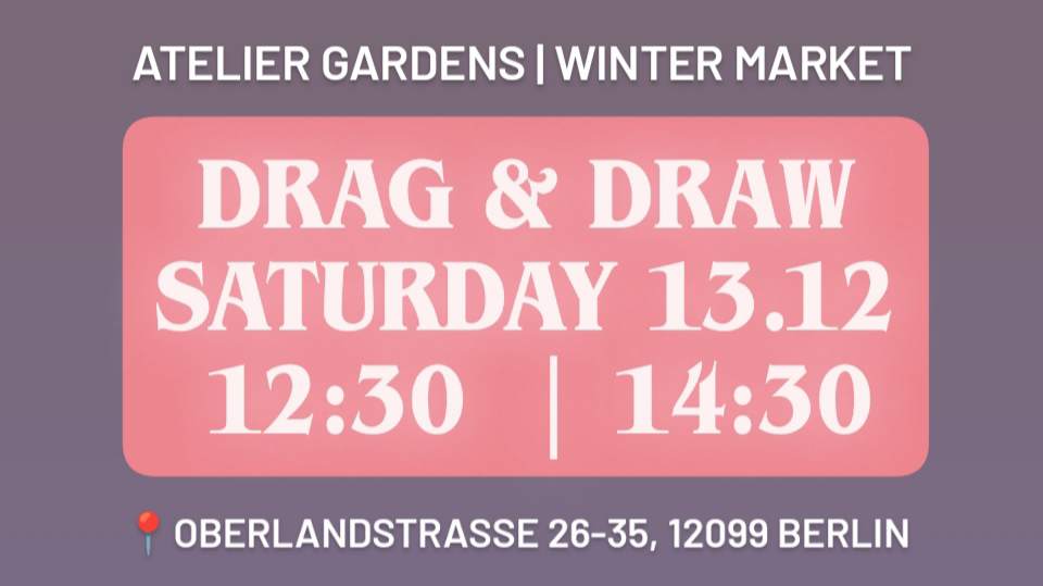 [FREE ENTRY] We're pleased to welcome Christmas with you at the Atelier Gardens's winter market! Both indoors and outdoors, the Atelier Gardens have prepared multiple activities and entertainment for the whole family! FOOD | GLÜHWEIN | LOCAL CREATIVE STANDS | WORKSHOPS FOR KIDS | CHOIR | DRAG SHOW | LIFE DRAWING ( and more...) QUEER & POSE : LIFE DRAWING WORKSHOP will host a very special session with Stella, magnificent Drag performer who's gonna pose and perform! You don't wanna miss it ! 📆 Saturday 13.12 | ⏰ 11:00 - 18:00 | Market Opening hours ⏰ 12:30-14:30 | LIFE DRAWING WORKSHOP ⏰ 14:30 | DRAG SHOW 🎫 FREE ENTRY ALL LEVELS : BEGINNERS WELCOME We're providing the basic tools such as paper sheets and pencils ! Join us and let's draw and connect together 🎄 🎁 More info @queerandposeberlin