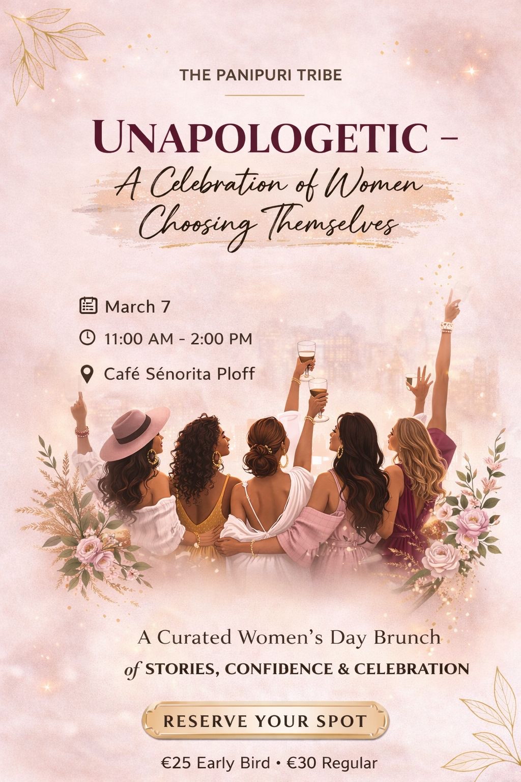 **The Panipuri Tribe – Women’s Day Special ** ✨ UNAPOLOGETIC – A Celebration of Women Choosing Themselves ✨ Hello lovely women This Women’s Day, we’re celebrating the main character in each of us. An **intimate brunch** created for women who want community, confidence, softness, and ambition — without apology. This is not a loud party. This is a table full of women who get it. A space to dress powerful. To speak honestly. To feel seen. To choose yourself — out loud. Because this year, we’re choosing ambition without apology and softness without guilt. ⸻ **Date** : March 7 ⏰ **Time** : 11:00 AM – 2:00 PM **Dress Code** : Something that makes you feel powerful **Location** : Café Señorita Ploff ⸻ **What the brunch includes** ✨ 3 spotlight stories from inspiring women in our community ✨ A guided “This year, I’m choosing…” intention moment ✨ Celebration toast ✨ Meaningful conversations in an intimate, uplifting space Brunch meal Fresh empanadas ☕ Coffee Ice tea Chips & salsa (**All included in your ticket**) ⸻ **Ticket Price** €30 Regular €25 Early Bird **Pay via PayPal** : https://www.paypal.me/ssuhany — choose Friends & Family (please add your name in the note) **to avoid extra charges. No refunds.** Limited spots to keep it intimate and meaningful. If you’ve been craving real connection — this is your table. Reserve your seat and celebrate Women’s Day surrounded by women who uplift each other.