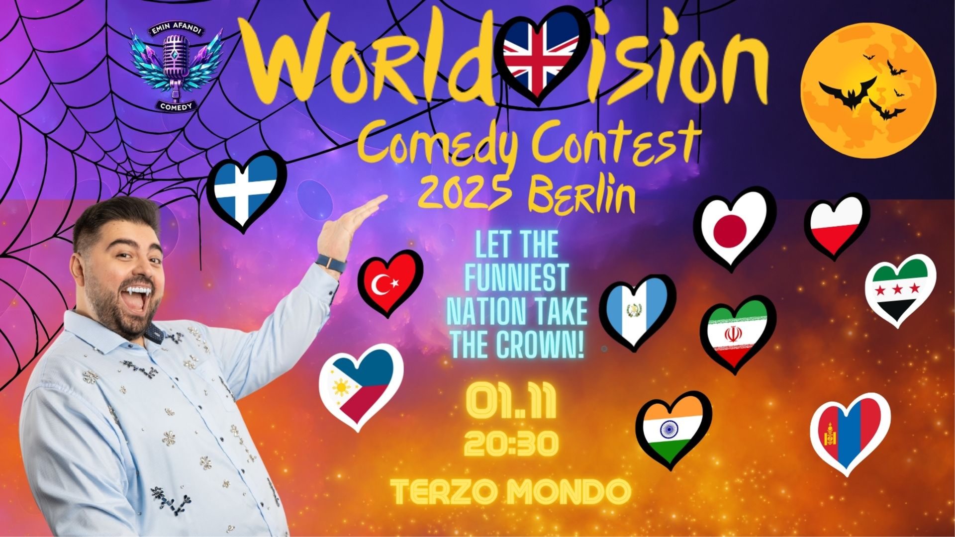 **International comedians, 1 stage! Who will be crowned the world's comedy powerhouse? Get ready for the showdown !** **๐ Eurovision-Inspired Comedy Event ๐** On Saturday, 01.11.2025, join us for the WorldVision Comedy Contest โ a Eurovision-style comedy showdown where international comedians battle it out to claim the title of the funniest nation in the world! The audience will cast their votes Eurovision-style to decide the winner. Participating Countries: ๐ ๐ธ๐ช Sweden \| ๐ฏ๐ต Japan \| ๐ฎ๐ณ India \| ๐ต๐ญ Philippines \| ๐ฒ๐ณ Mongolia \| ๐ฌ๐น Guatemala \| ๐ต๐ฑ Poland \| ๐น๐ท Turkey \| ๐ฎ๐ท Iran ๐ฅ Side-splitting performances by top English-speaking comedians representing different nations! ๐ A lively, international audience in the heart of Berlin. ๐น Delicious drinks, great vibes, and endless laughter! ๐ When: Saturday, 01.11.2025 ๐ Where: Terzo Mondo, Grolmanstraรe 28, 10623 Berlin โฐ Show Starts: 20:30 ๐ซ Tickets: **TOP 10** \- 15โฌ \(3\.31โฌ upfront \+ 12โฌ at the door\) **Group Ticket(Group of 4 and more)** \- 12โฌ \(3\.31โฌ upfront \+ 9โฌ at the door\) per person **Invisible VIP - Safe from Crowd Work ticket.We leave you in peace!**\- โฌ18 **Walk in** 20โฌ at the door (if seats are available) ๐ซ Non-smoking venue ๐ณ Cash or card payments accepted ๐๏ธ **Get your tickets now** and come support your favourite country and comedianโbecause laughter knows no borders, but bragging rights definitely do! Here are some reviews from our audience members: ***"Great show. Many hilarious comedians, we loved it"*** \- Dani\,01\.04\.2025 ***"We laughed so much. Ten comedians each had five minutes, and each one was funnier than the last. All ten delivered, and more than half of them were brilliant. The host did a great job. Awesome location and awesome atmosphere."*** \- Leo\,07\.12\.2024