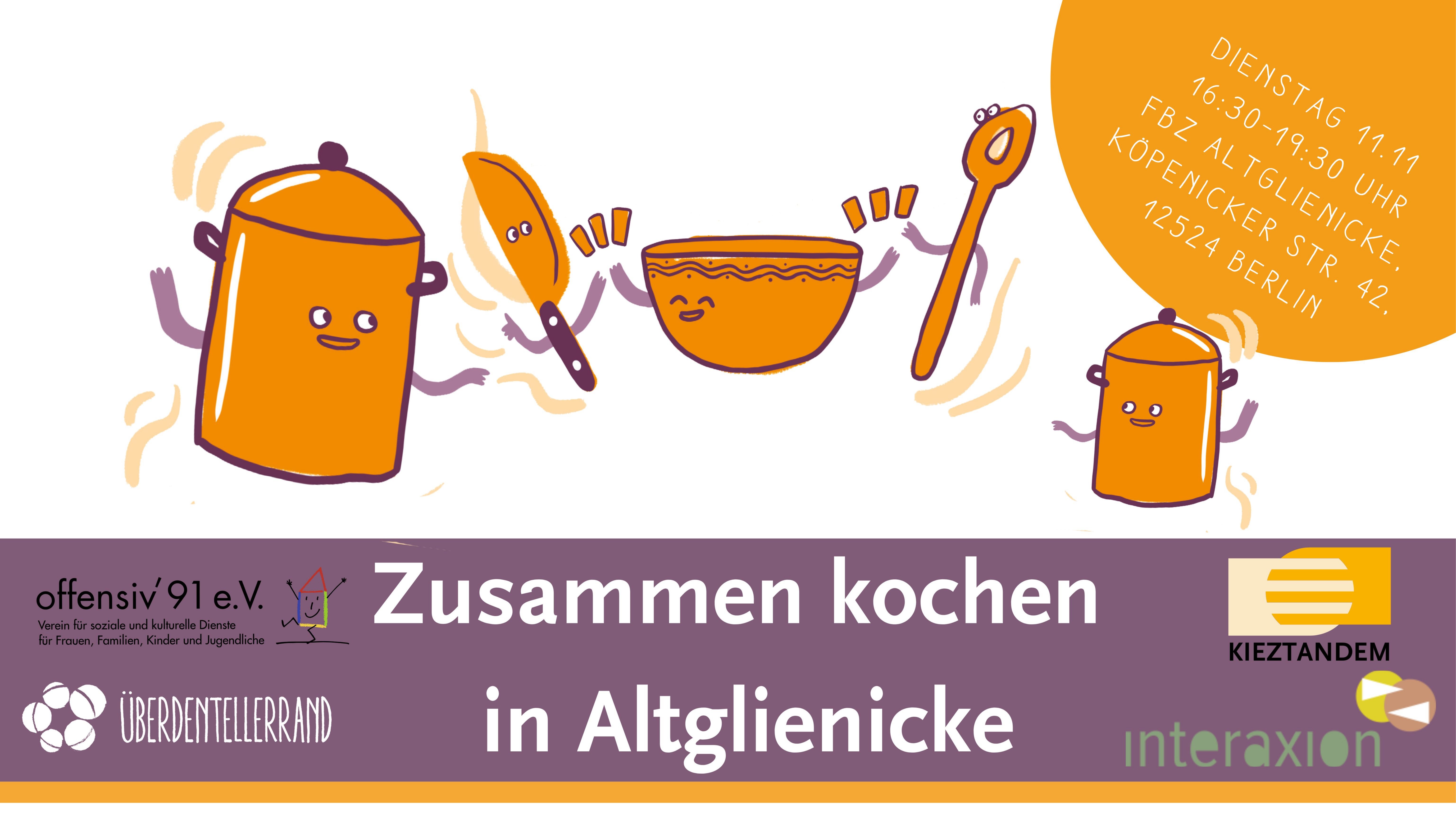 Liebe Community! Am 11. November haben wir einen besonderen Kochnachmittag. In einer schönen Kooperation mit Kieztandem und InteraXion (offensiv'91 e.V.) wollen wir in Altglienicke gemeinsam kochen. Dabei kommen verschiedene Ehrenamtliche aus verschiedenen Vereinen zusammen, und es wird eine bunte Mischung unterschiedlicher Gerichte gekocht. Außerdem werden wir uns austauschen, zusammen lachen und neue Leute kennenlernen. Wir wollen internationale Rezepte ausprobieren, Nachbarschaft kennenlernen und gemeinsam essen. Alle sind willkommen! Kommt vorbei, bringt Appetit mit und feiert die Vielfalt des Kiezes! 📍 **Wo:** FBZ Altglienicke, Köpenicker Str. 42, 12524 Berlin 🗓️ **Wann:** Dienstag 11.11.25, 16:30 - 19:30 Uhr Anmeldung per Mail bitte an: [INFO@KIEZTANDEM.DE](mailto:INFO@KIEZTANDEM.DE) Über den Tellerrand Team