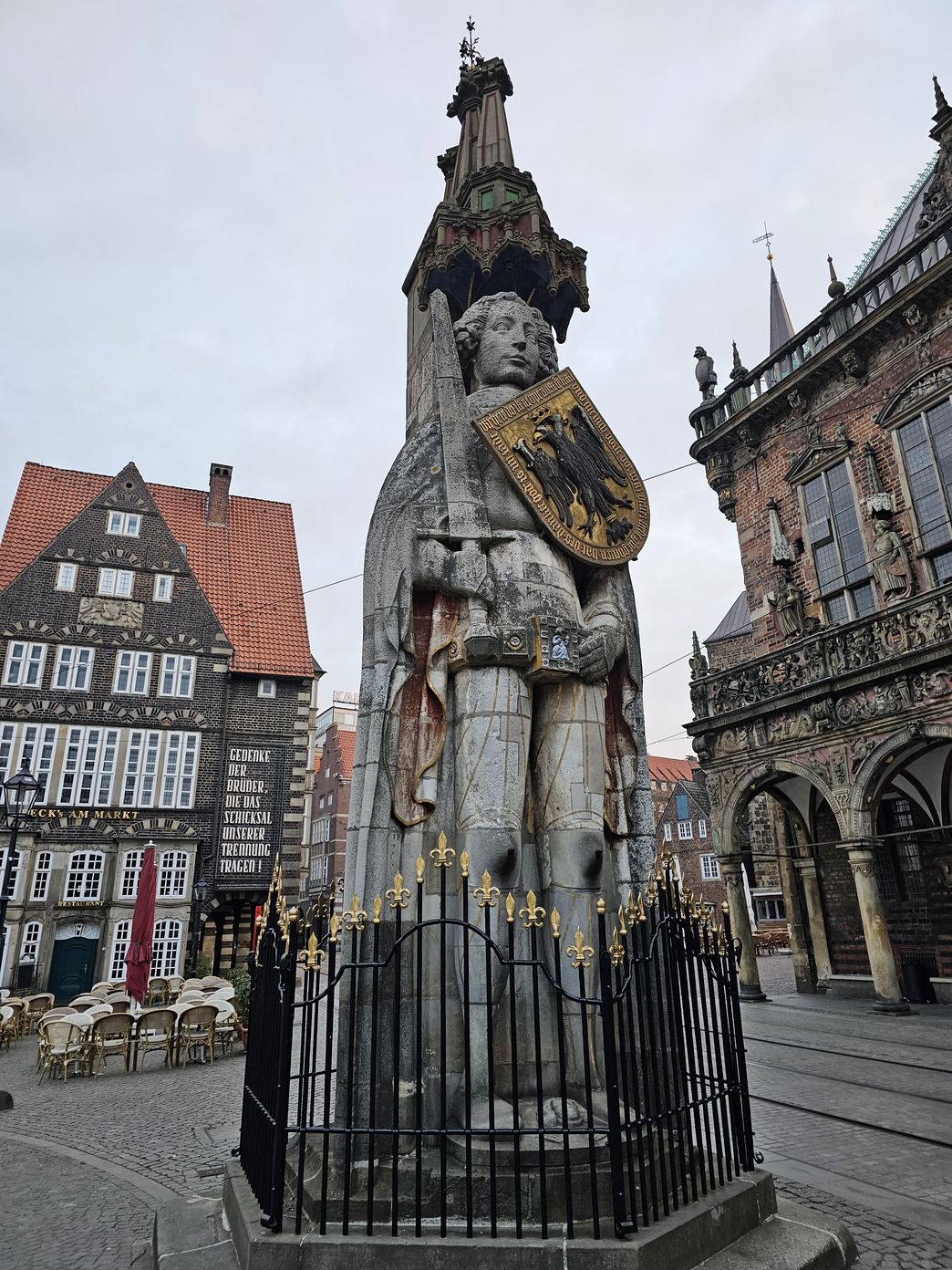 Stone giant symbolising freedom & market rights, with a shield bearing an imperial coat of arms.