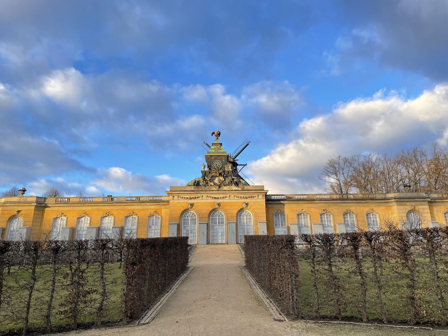 Formal gardens around Sanssouci Palace, with notable buildings like Sanssouci Picture Gallery.