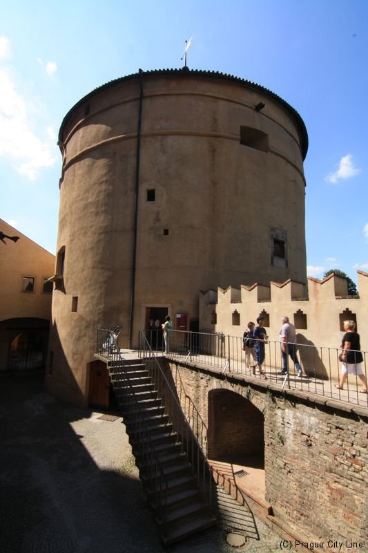 15th-century fortified cannon tower. Circular tower, part of Prague castle walls, once used as a gunpowder store & alchemist's workshop.