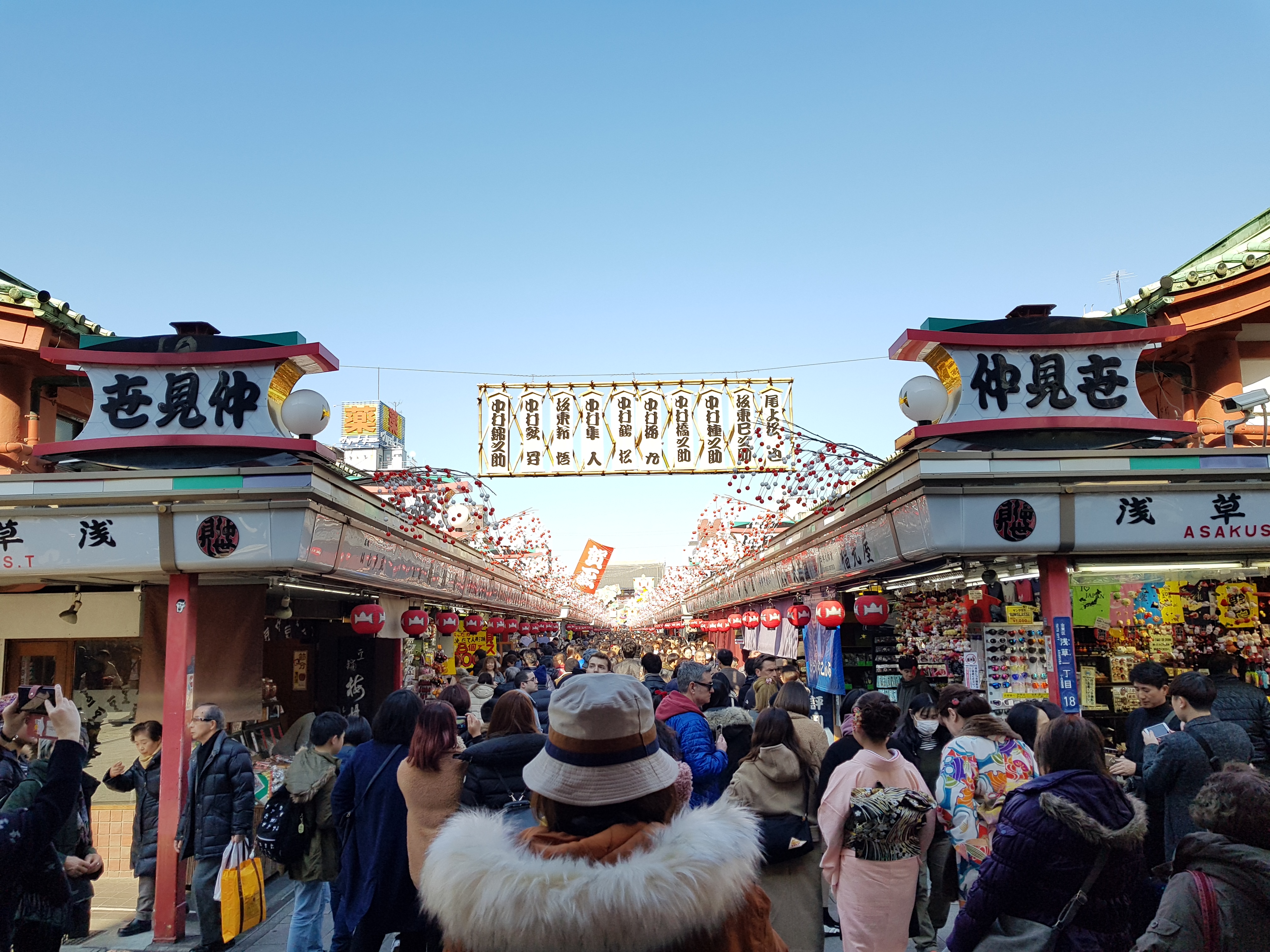 Bustling shopping street connecting the main gate of Sensoji Temple & the main hall.